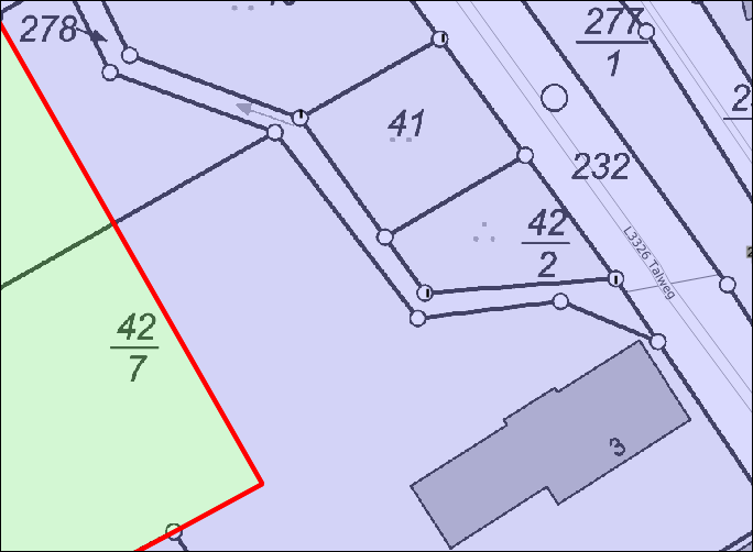 Hier mal ein Bild um zu zeigen wo wir bauen wollen: Flurstück 41 und 42/2 (in lila). Die 278 mit grauem Pfeil zeigt den Mühlgraben inklusive Flussrichtung des Mühlgrabens.